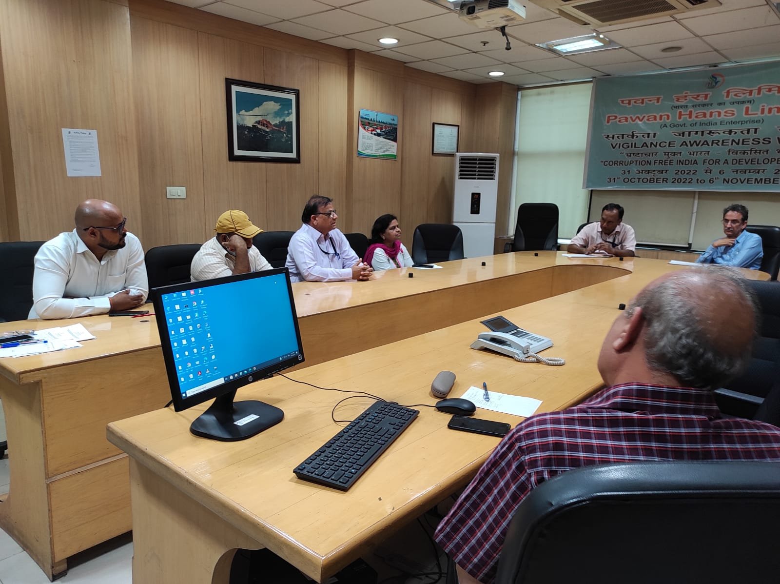 आयोजन 4 - श्री अनुराग शर्मा, महाप्रबंधक (सतर्कता) भाविप्रा द्वारा चल रहे सतर्कता जागरूकता सप्ताह के भाग के रूप में पवन हंस नोएडा कार्यालय में निवारक सतर्कता उपायों पर संवादात्मक सत्र आयोजित किया गया। रोहिणी और मुंबई में क्षेत्रीय कार्यालयों के अधिकारी भी वीसी के माध्यम से ऑनलाइन जुड़े हुए थे